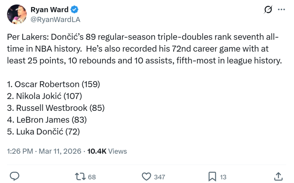 这是东契奇加盟湖人仅一个赛季第6次拿下30+三双,成功超越名宿科比,独占湖人队史第五。